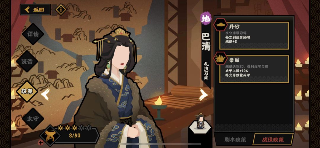 李冰整体技能和巴清相似,但“治水”只需要5点粮草“丹砂”需要6点粮草,虽然议事中的“驰道”和该技能效果一样,但是“驰道”前期条件太多能学习的时候已经到了偏后期,收益就不如“治水”来的多了。到了后期的时候一般统兵也强化4次了,“天府”的前提条件也不是那么重要,因此在我个人看来李冰比巴清更为好用,而且人级更易获得。