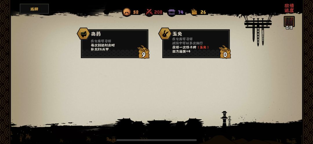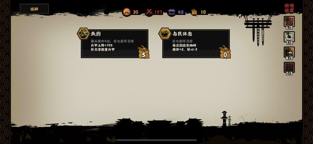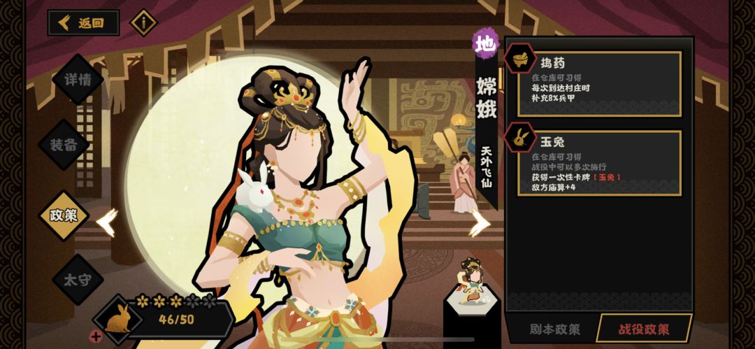 嫦娥主打兵甲优势,补充8%的兵甲加上村庄本身收集的兵力每回约补充10%几,以35w上限为例进一次村庄就能获得4w左右的兵甲,我们就无需去点补充兵甲的兵种,能把粮草用在其他更有用的地方。“玉兔”造成的伤害不是特别大,但胜在无需粮草。需要注意的是“捣药”是在仓库学习,可技能实际生效地点是在村庄与“玉兔”在不同地点,如果两个地点不在一条线上个人建议优先选择补充兵力。