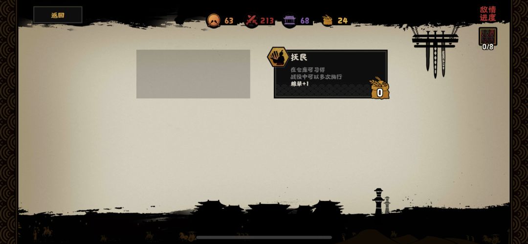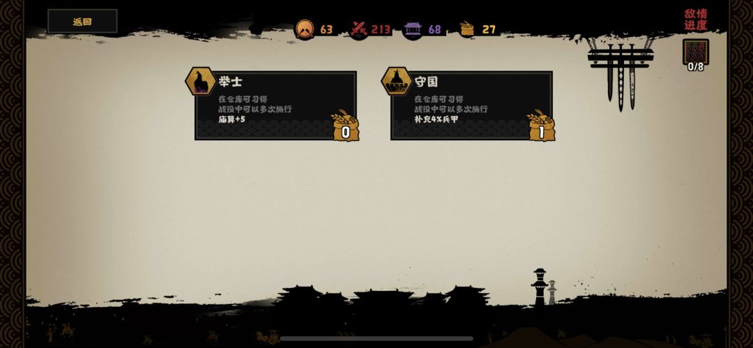 萧何的技能虽然增益不大,但是除了“守国”需要1点粮草外其余都可以0粮草施行,胜在前期不需要攒粮草去点技能,高庙算能配合其他名臣的技能触发效果。并且技能都是可以多次施行的,整场战役下来脸黑的情况下也有十个仓库左右,综合就是付出小收益高。