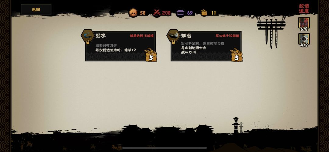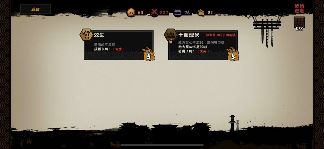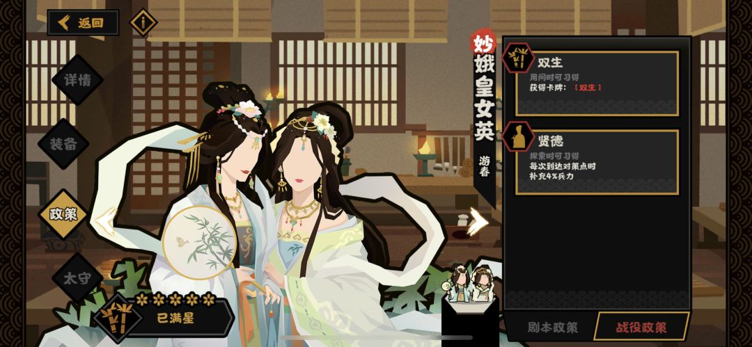 娥皇女英在韩信北伐中开局优势相对其他战役更明显,因为开局就能使用该战役中韩信自带的“郎中骑”,配合双生打出两队骑兵。“双生”主要搭配强力卡牌达到1+1>2的效果,除名臣自带卡牌外,携带娥皇女英就要多攻占三级据点和多去对策点获得卡牌,在对策点中能使用兵甲换取粮草,正好“贤德”在对策点时能补充兵力让我们多一些兵甲预算。
