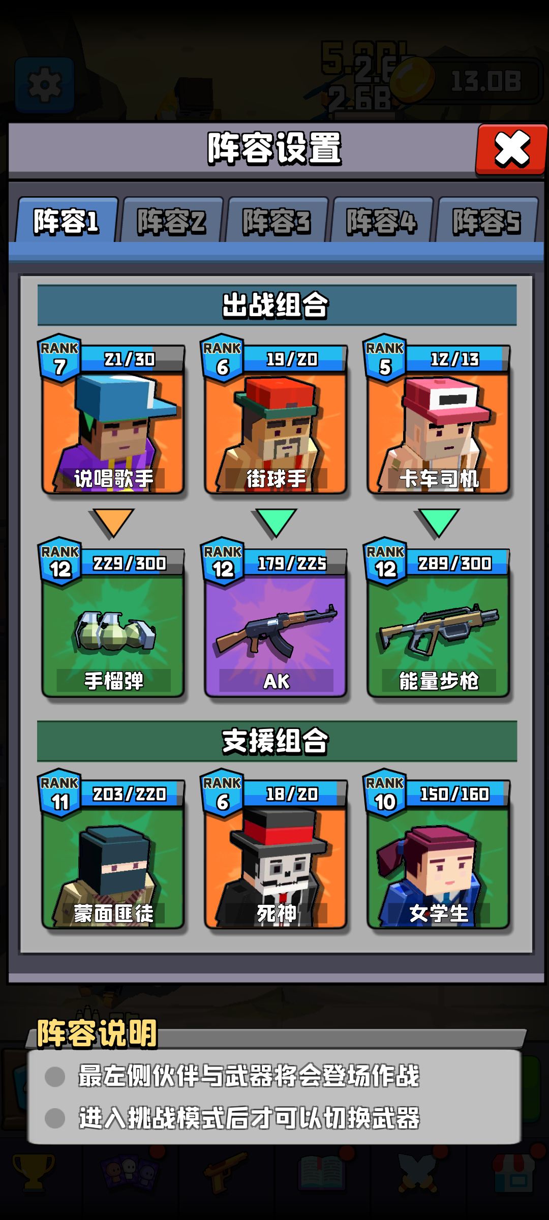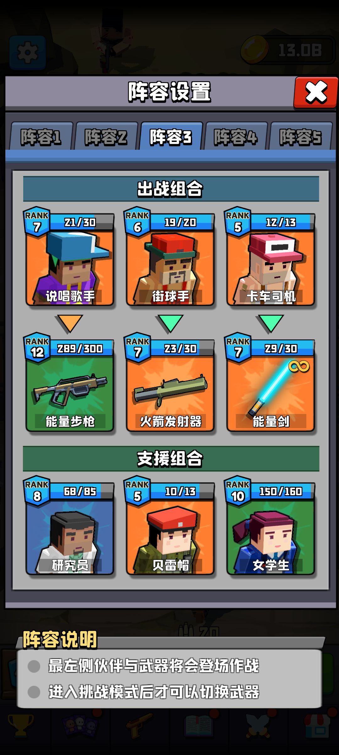 注意!这个游戏最大的特点就是你在推主线的时候,所有伙伴的攻击,防御,机枪伤害是共享的!也就是说只要你升级你的任何一个伙伴,都是有利于你队伍整体提升的。所以我推荐大家像我这种绝对的平均主义升级。因为伙伴升级的费用是指数级增长的,笔者以前也试过专攻一个人,可是发现在你那个人等级明显高于整体等级时,一个人升一级需要好几天的时间!