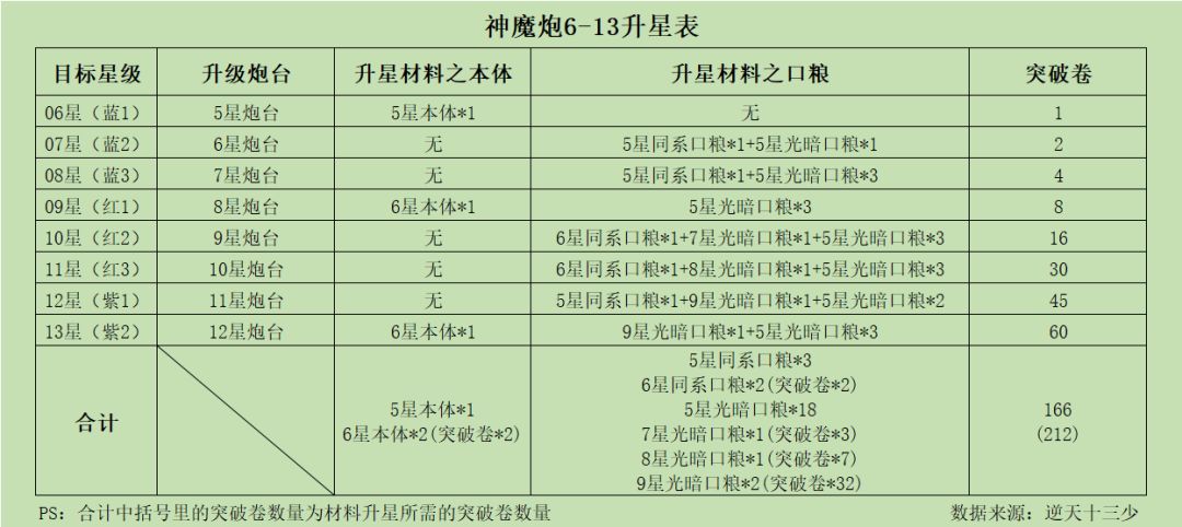 光暗炮和神魔炮6-13星升星所需材料表