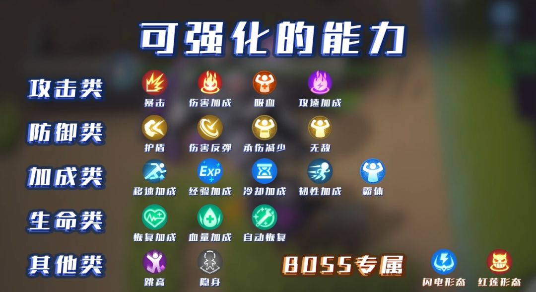 加成类:移速加成、经验加成、冷却加成、韧性加成、霸体