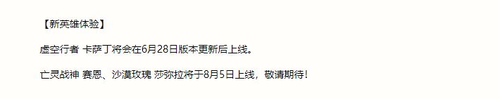 兄弟们,好消息!新英雄卡萨丁,沙弥啦,塞恩将在3.3版本上线手游!卡萨丁将在6月28号率先上线体验服!