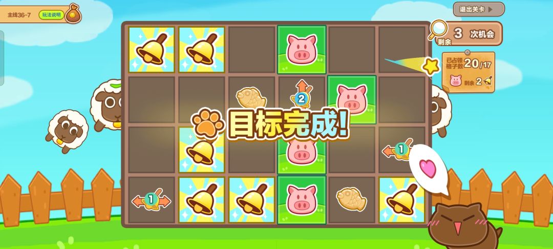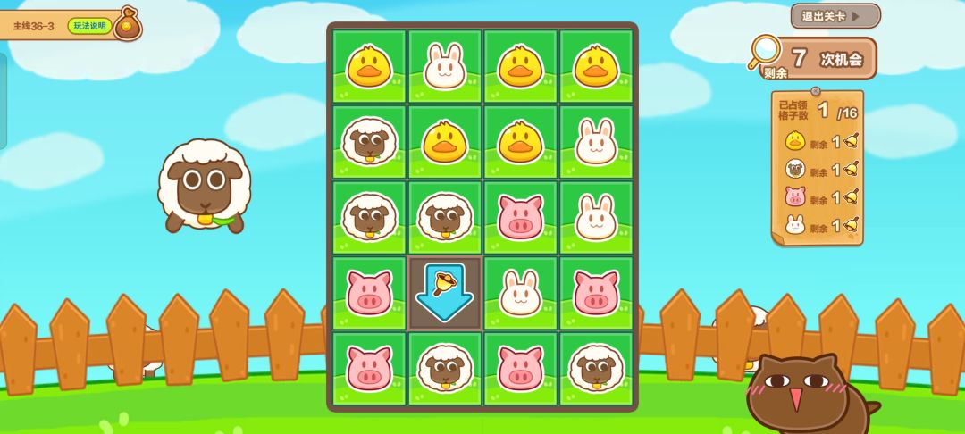 🐷剩余1🔔,即所有🐷图案的格子中只有一个🔔,当某种动物图案的铃铛数降低至0时,页面内所有该动物的图案都会被翻开(算在已占领格子数内),也正因为这种机制,新关卡不会出现找齐铃铛但是已占领数不达标的情况