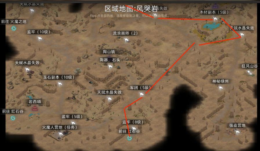 1级副本打完后往红石城走,接取谷沙的任务。因为谷沙任务目标在双月山谷,现在就往双月山谷走,路过风哭岩时,顺便升级和拿天赋水晶。