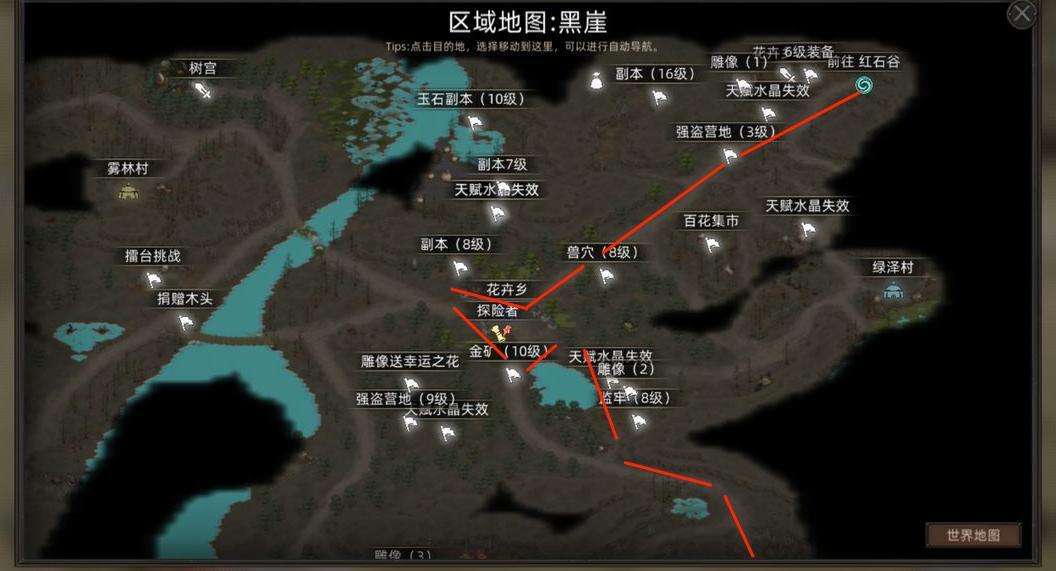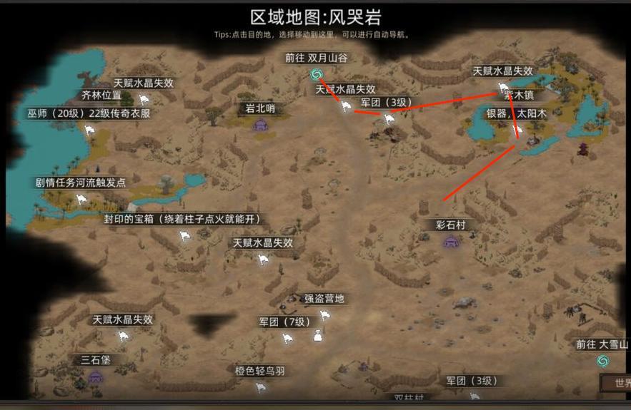 开始我选择在红石谷,为的就是接谷沙的任务(该系列支线做完送马王霹雳75移速)。这是我大致的路线图。