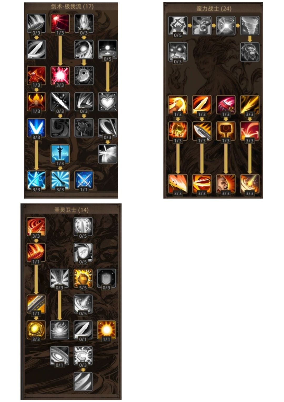 蛮力——穿刺专精+1 、穿刺大师+1、穿甲精通+3 、斗殴专精+1、斗殴大师+1、气震波+3、劈砍专精+1、 劈砍大师+1、锋刃+3、钝击专精+1、钝击大师+1、锤击+3