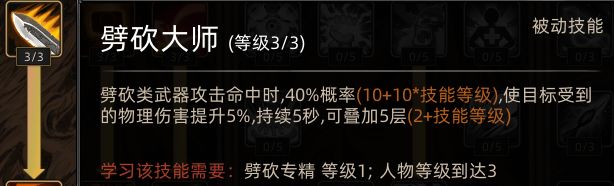 然后我们可以点出劈砍系的三个技能,每个只点1级即可,快速点出锋刃。
