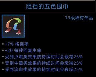 我们还可以选择这个五色围巾,中毒流血点燃三个效果都有抵抗,还有每秒生命恢复。可以在古老秘仪之窟刷到。