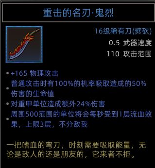 后期就有讲究了,武器我们选择名刃.鬼烈,他有让周围500范围的单位每秒增加一层流血效果的buff,可以搭配狩猎精通打出巨额伤害。但由于不分敌我,所以被称为独狼刀,用这把武器基本就是一个人去无双。