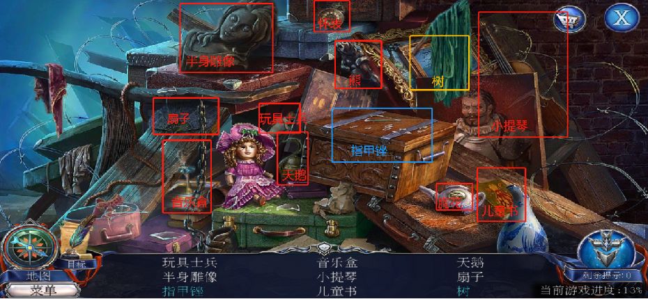 注:“树”需要先扯开布,“指甲锉”需要先打开箱子