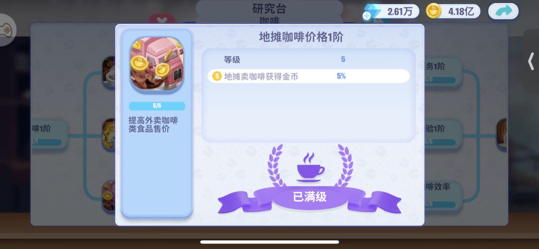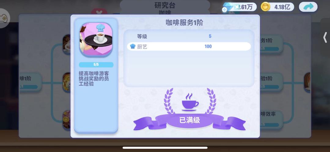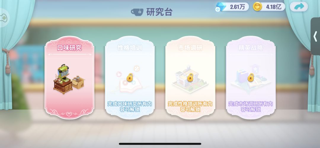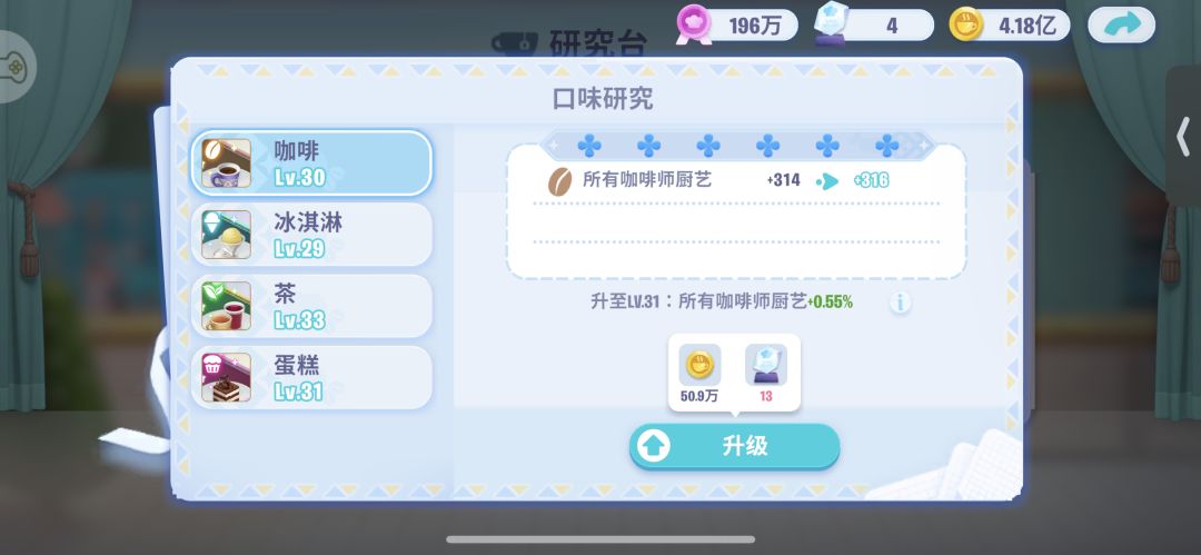 口味研究根据职业分为四个升级项,分别是咖啡、茶、甜品及糕点。