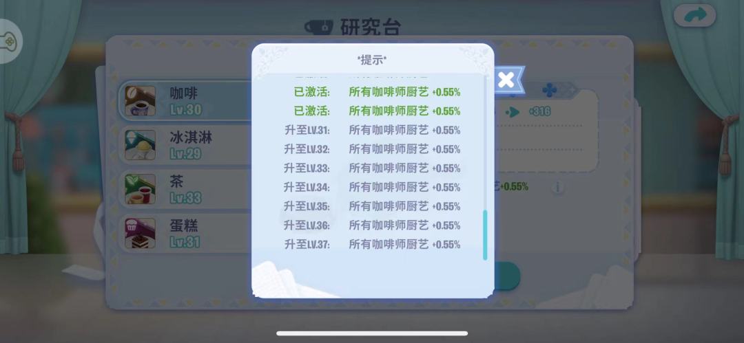 第三个蓝色按钮是研究台的另一类研究,这部分的研究直接增加员工厨艺的项目较少,而是在小店的各种玩法中去增加相应的数值。为了和绿色的区分开,就叫蓝色研究台吧;(命名真就非常随意.....)