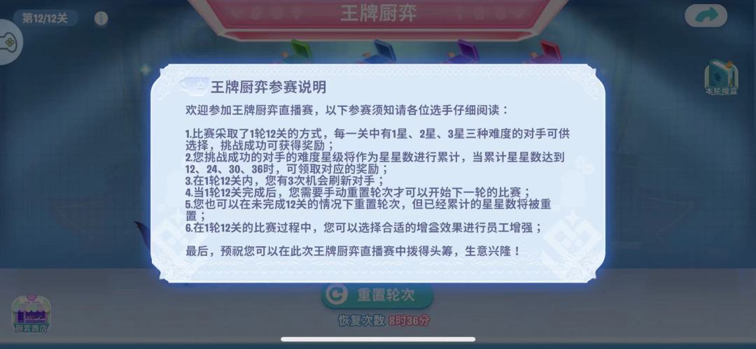 每天和本服务器的玩家对战,共12关,根据厨艺高低,每一关对手分为1星、2星和3星三种难度。