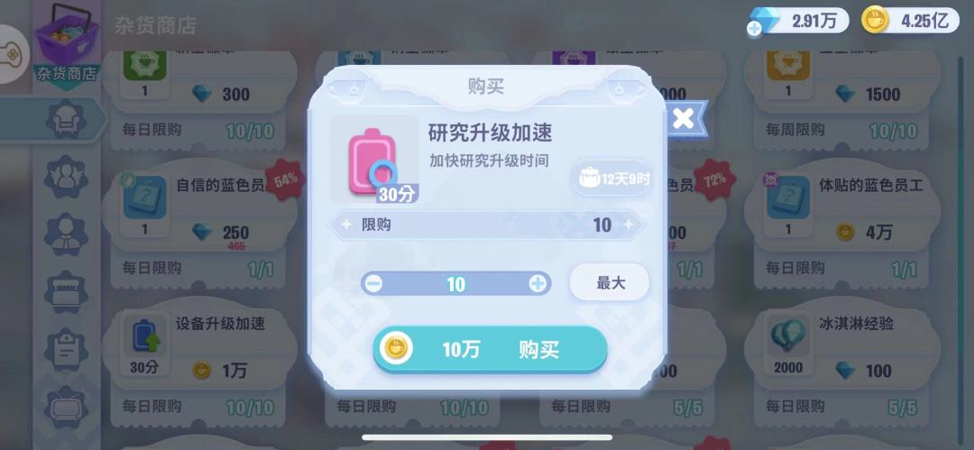 如果是金币购买【研究升级道具】的话,每天可以购买最多10个,每个1万,1个道具30分钟,共5个小时。