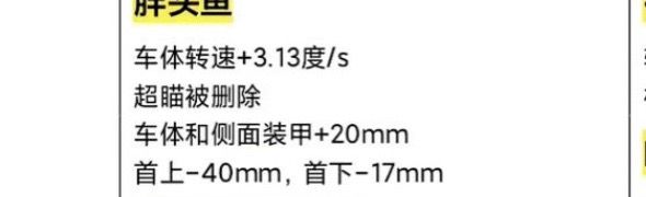 说实话,我感觉这辆车的加强方向应该是强化正面装甲,首上-40这个搓刀可以说是基本上把正脸搓废了,原本230正脸等效300,这下就只有不到250的等效了,再加上ap转正….所以,我不太看好胖头鱼接下来的表现,不过呢,在直接更新实装之前,还说不好具体表现,说不定就因为3.13度/s的转速加强而手感大增呢……
