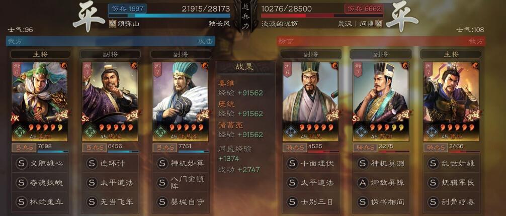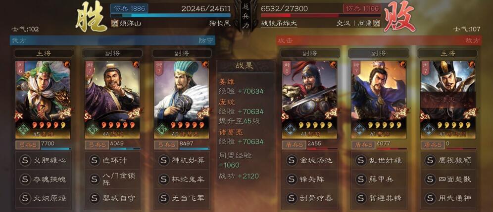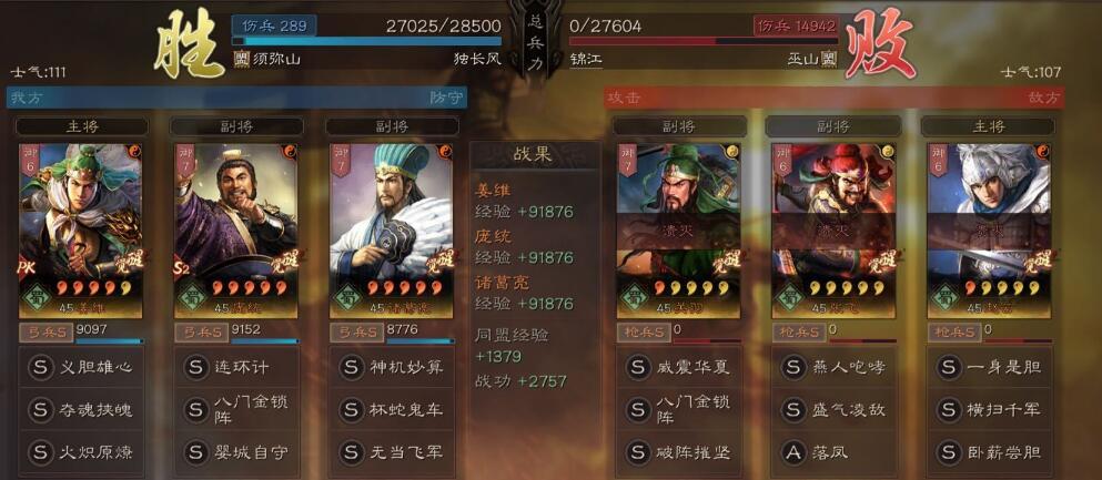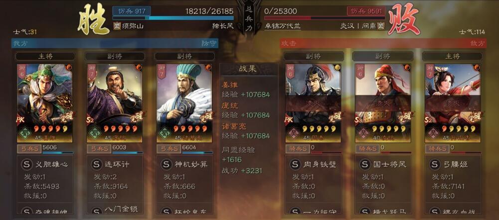 总结:这个阵容比起传统的麒麟弓来说,让演员庞统当成了辅助,脸好也能进行伤害的补充,主要输出还是姜维和诸葛亮,还是比较稳定的,比起传统的麒麟弓玩法多了个“火炽原燎”,输出方面更加的稳定同时拥有了稳赢藤甲盾的强度!只能说,这个阵容主流队伍都能打,脸黑的时候还是容易输给吴骑或者虎臣弓这样超高爆发的阵容!