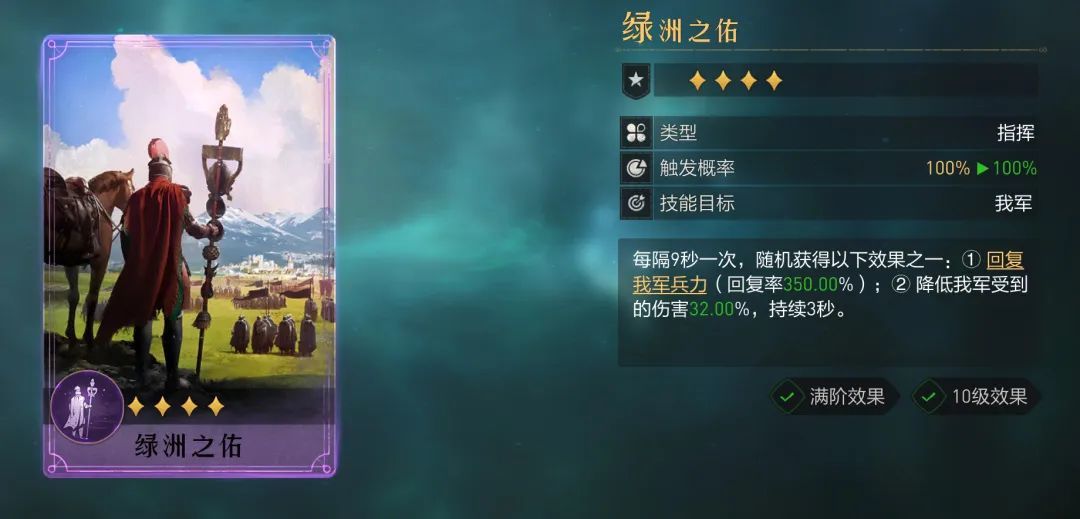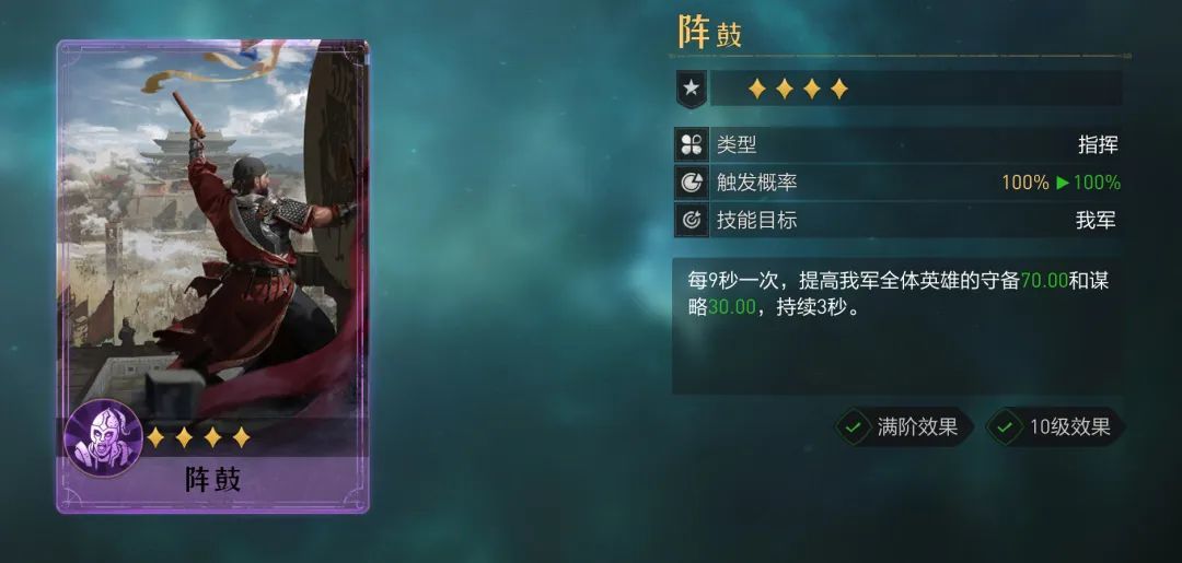 9秒一次持续3秒,折算成每秒全覆盖就是提高我军全体23点守备和10点谋略,综合属性总共提升了约100点,如魏兰弓这类阵容天生抗性较弱的,可让阵容辅助位装配该技能。