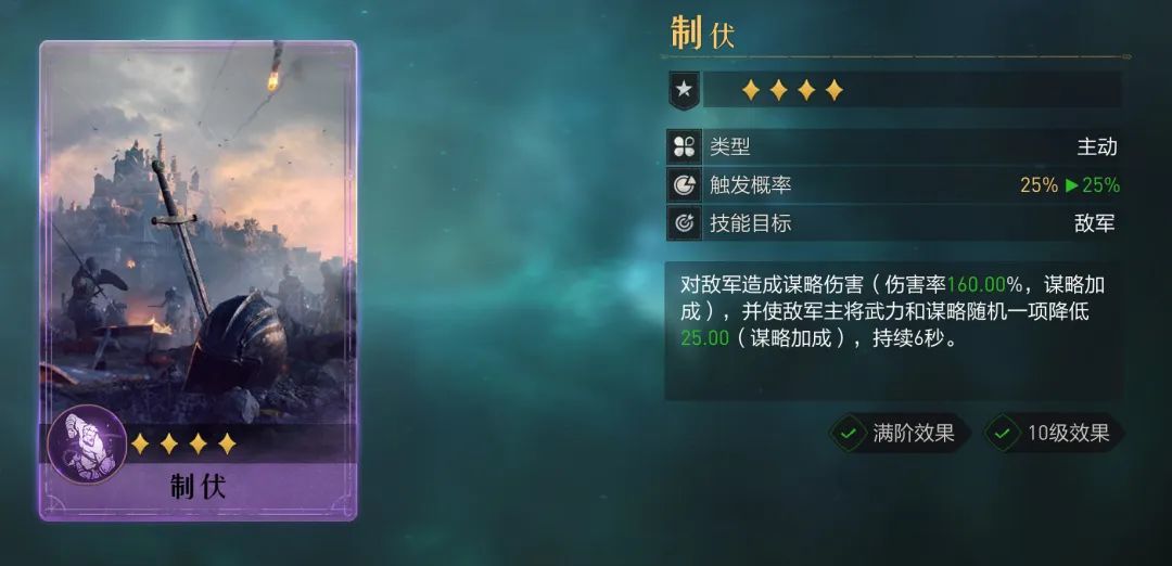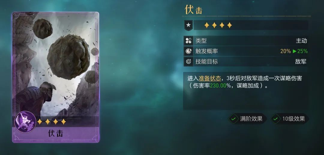 非常契合名字的技能2号(两只狗头),谋略准备型技能,毁灭的预示的下位替代,虽然卡面上的伤害率差距较大,毁灭高了95%。但伏击升星简单,满星后触发概率能到25%,此时再去对标白板毁灭差距就缩小了很多,阳谋和万里平戎策也是同理。