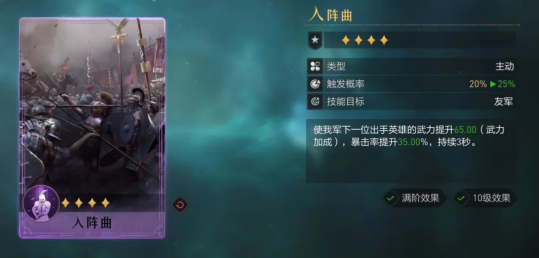 入阵曲的武力提升受武力加成影响,后期实际提升能达到130+,再加上35%的暴击率。不过他并非常驻提升技能,而是25%概率触发生效,按照3秒一回合折算,在没有加概率战马的情况下,平均12秒触发一次,持续3秒。