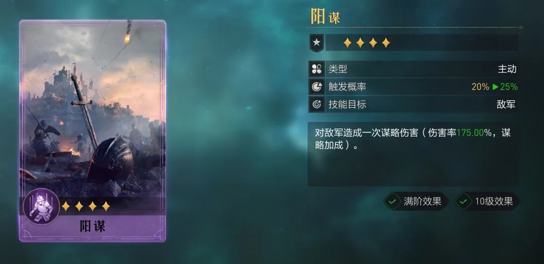 伤害率相对阳谋少了15%,但是多了一个降属性效果,持续时间达6秒,按照25%触发率平均是12秒一次,等于50%的覆盖率,降属性受谋略加成影响,最终效果在50点左右,折算成全覆盖就正好回到25点的样子。25点属性对技能加成的影响=25×0.3%=7.5%技能加成,一个300%伤害率的技能降低7.5%就是22.5%,如果按照对面主将2个输出技能、1个主将技来算,就是3个22.5%,哪怕他是武力和谋略随机降低,那也有一半对点,性价比高于阳谋,适合英雄和阳谋一样,谋略型英雄都可以。