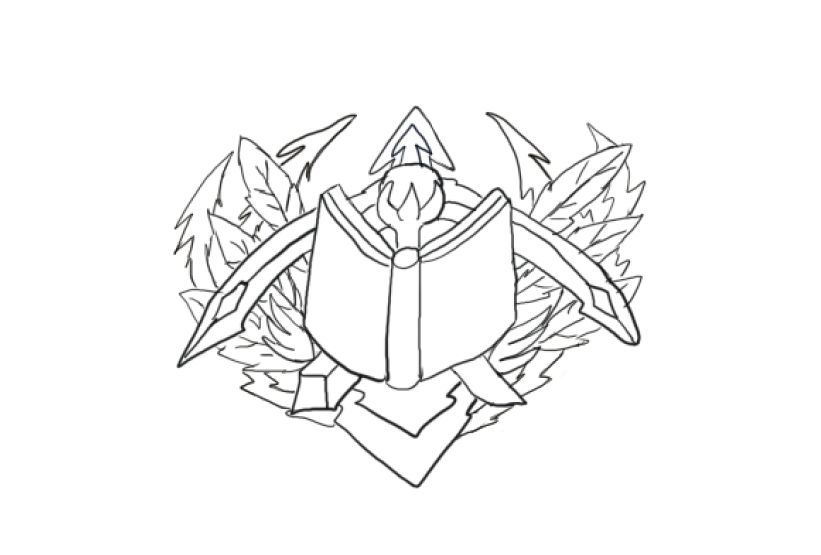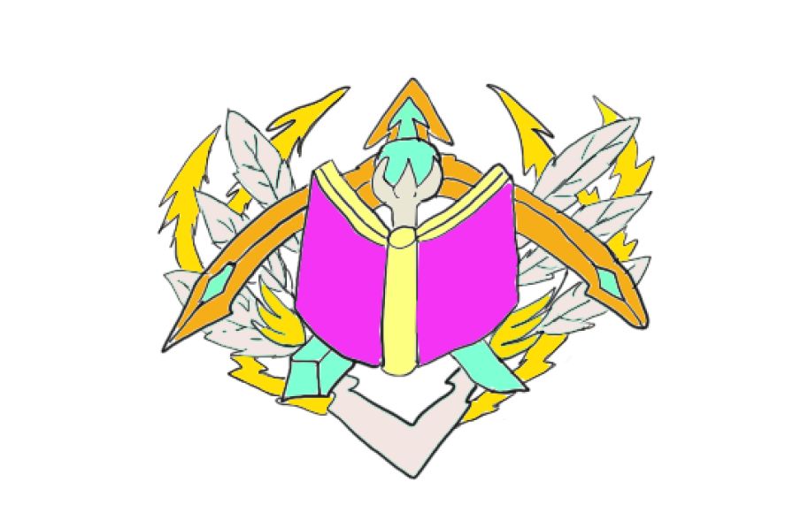 中间的书本代表法师的魔法书,左边是战士的剑和右边的忍者是忍刀,代表着书是知识的象征,也代表暗藏杀机(也可能是本小H书)书上的是牧师的法杖,源源不断的魔力,弓箭代表游侠,象征着敏锐,鹰击长空,两旁的羽毛笔象征勇者部书写的攻略,周围的闪电代表势如破竹 蒸蒸日上