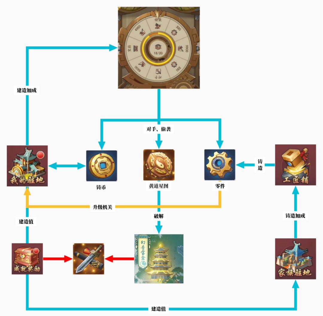1. 到了后期阶段,大家尽量将铸币收取时间安排在晚上21点以后到第二天9点前这个宵禁时间段,因为收取铸币会让排名上升,增加了大佬对我们进行攻击掠夺的几率,导致机关频繁被打爆,修复建筑所用的零件完全供应不上,所以我们要利用好家族成员的帮助修复次数和被帮助修复次数,原则:机关不被打爆,不进行修理和请求帮助修理。