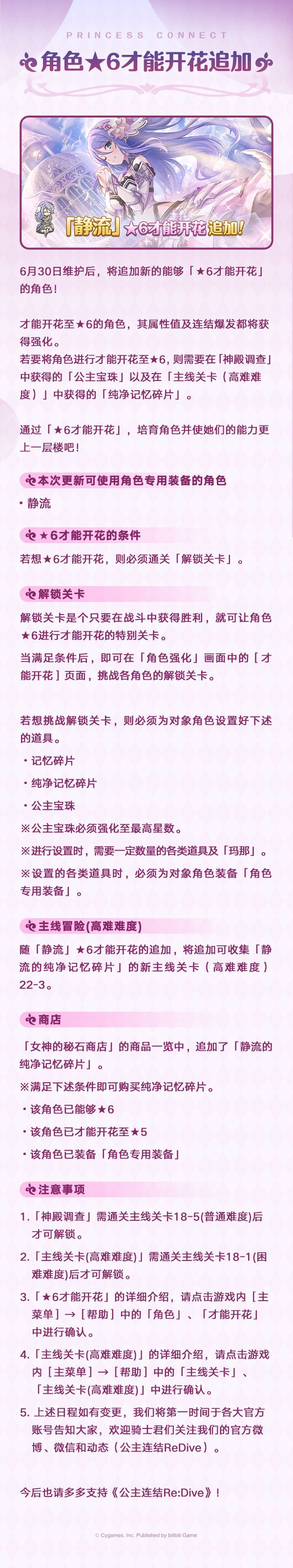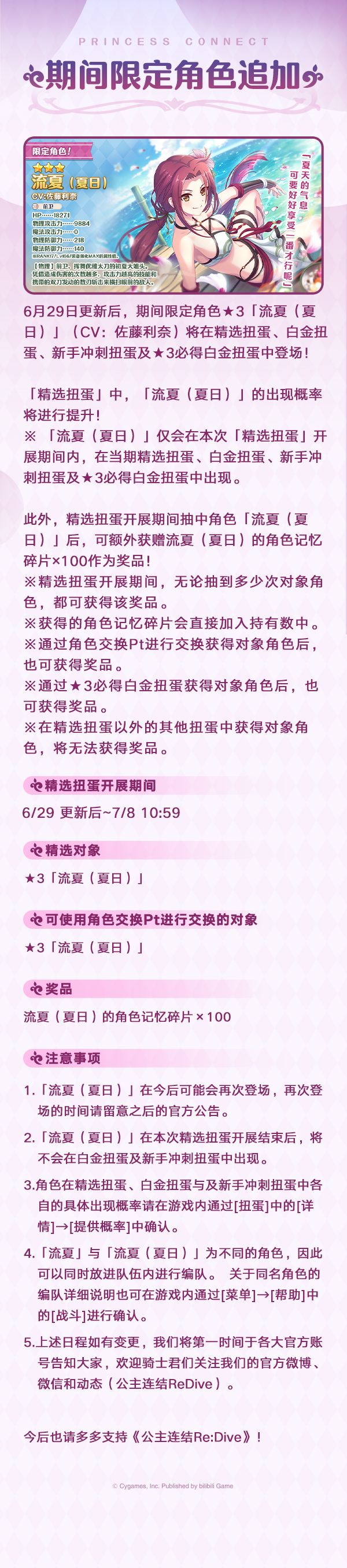 6月29日更新后,期间限定角色★3「流夏(夏日)」(CV:佐藤利奈)即将登场!游戏内将同时开启「流夏(夏日)」精选扭蛋,「★3必得白金扭蛋」将持续开放至7月3日23:59;同时,游戏内将于6月30日维护后追加能够「★6才能开花」的角色;还将追加新的角色专用装备,并追加新的游戏内容!