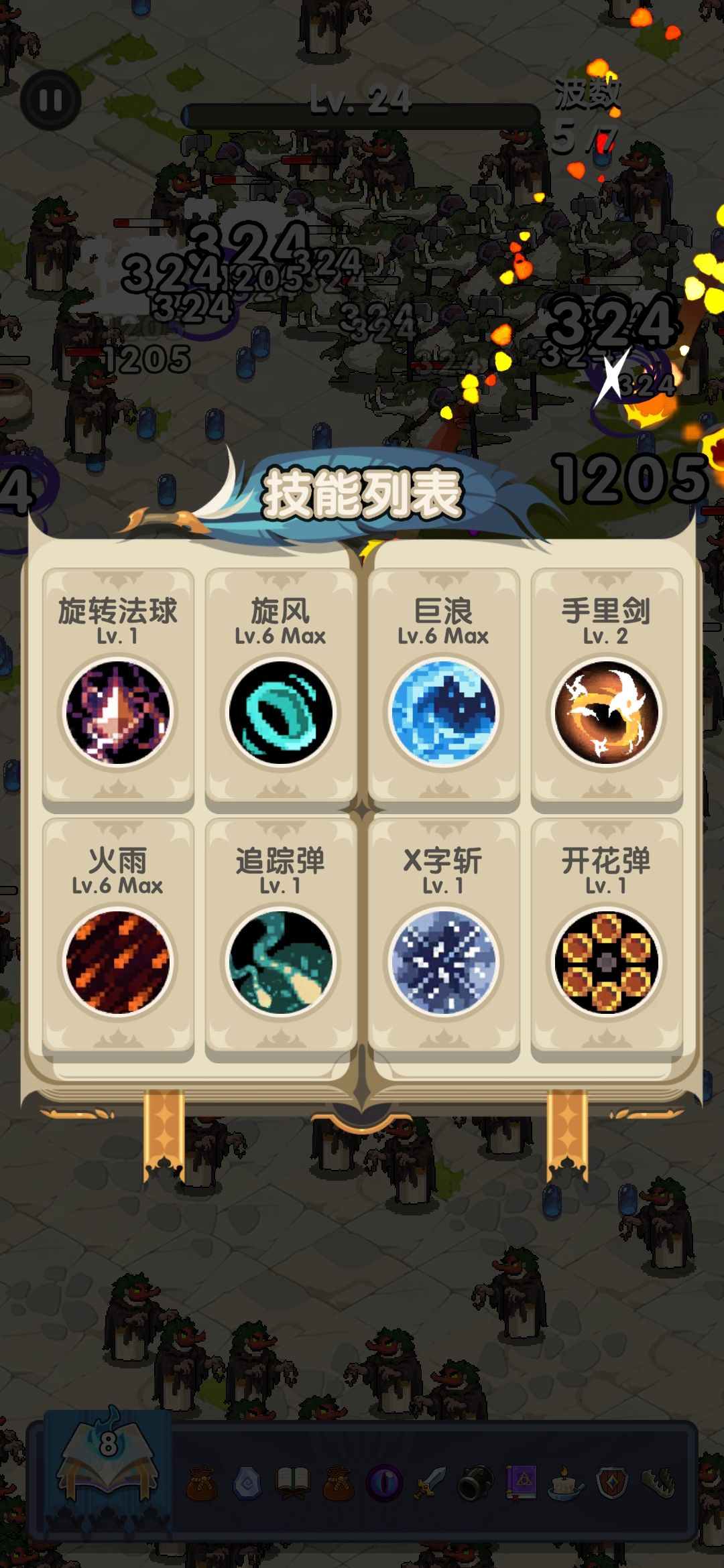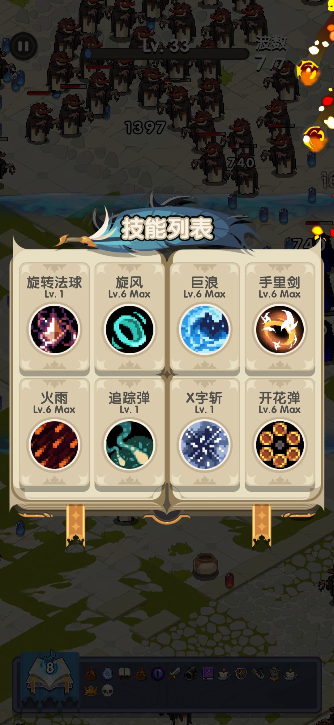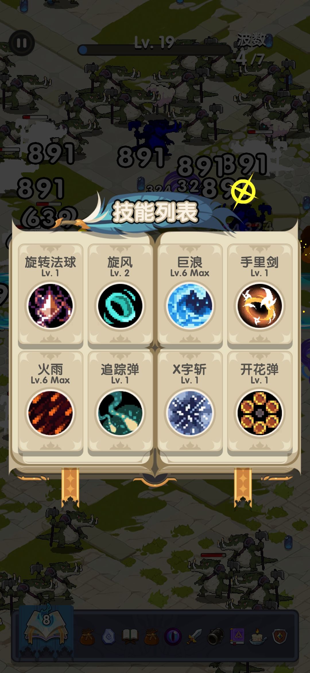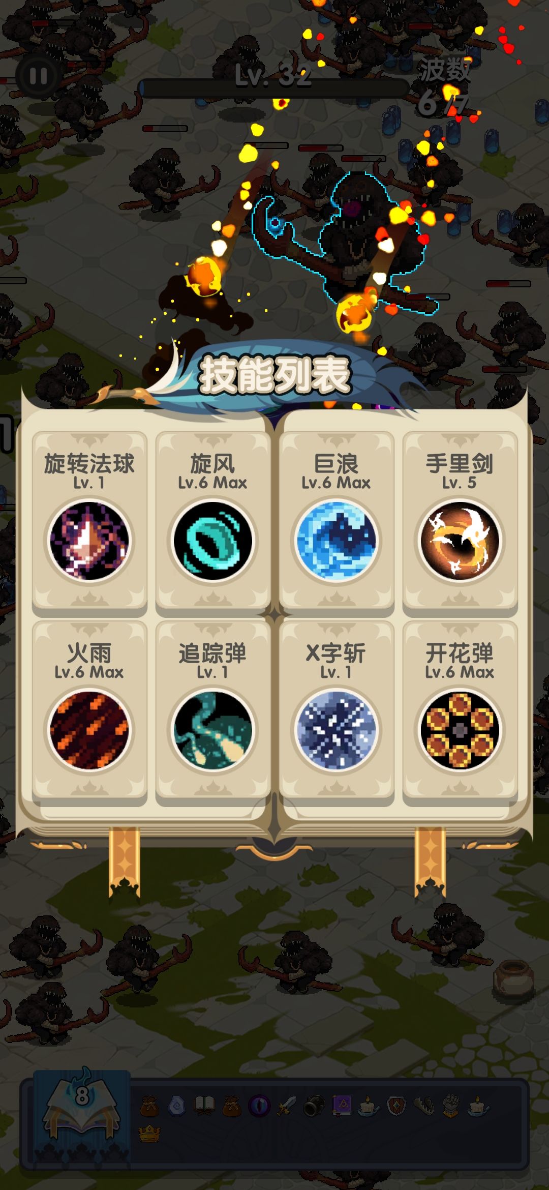 另外前期如何度过,激光,闪电链,手里剑都是不错的选择,根据得到的秘宝选就好,最好能在8级的时候填满8个技能,这样后边每次升级给到的技能都是已选的,就能够快速升级技能。