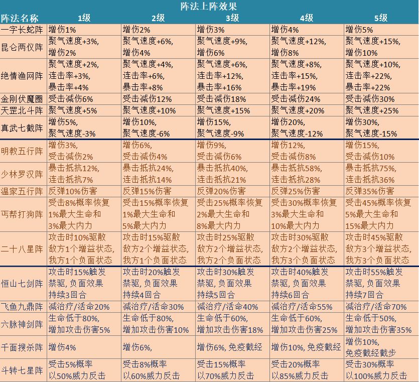 应该是只出到了天龙阵。目前流通的版本不是跟不上版本更新就是已经盘出了电子包浆,而且最大的问题是没有清晰地标志出武林阵、天龙阵、乾坤阵的界线。这三种阵法的成本可以天差地别。所以这边给大家带来了一份重制版。每份表格前6个是武林阵,中间红色字的5个天龙阵,最后蓝色字的5个是乾坤阵。