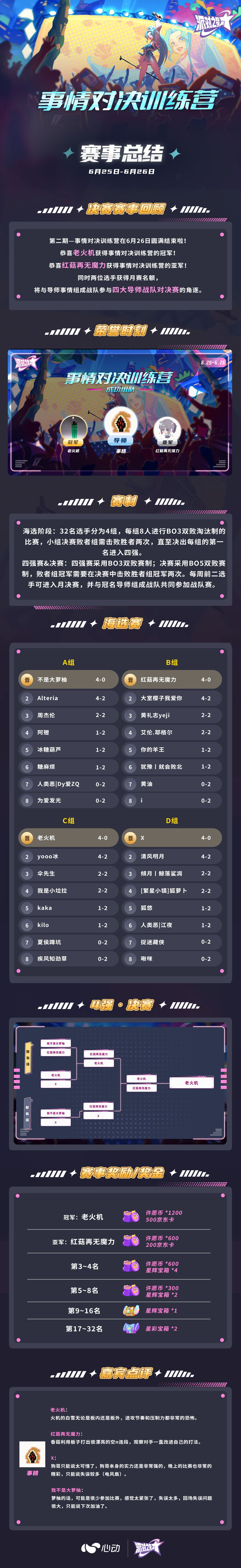 成功报名的32位选手在6月25日的海选赛中经过8轮的比赛,共有4位选手晋级决赛,在6月26日的决赛中,选手们经历了5轮激烈的比赛过后,最终由老火机夺得事情对决训练营的冠军,红菇再无魔力获得亚军,让我们恭喜他们!