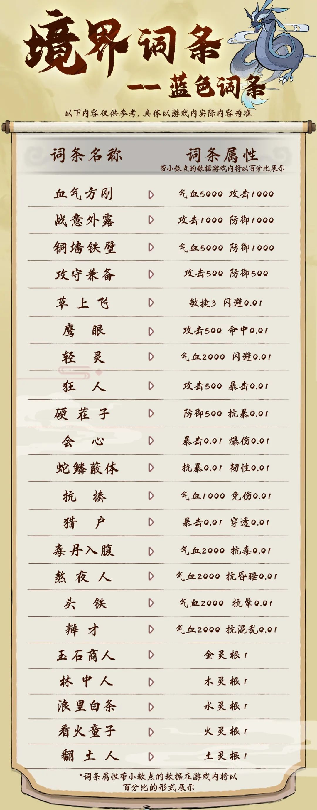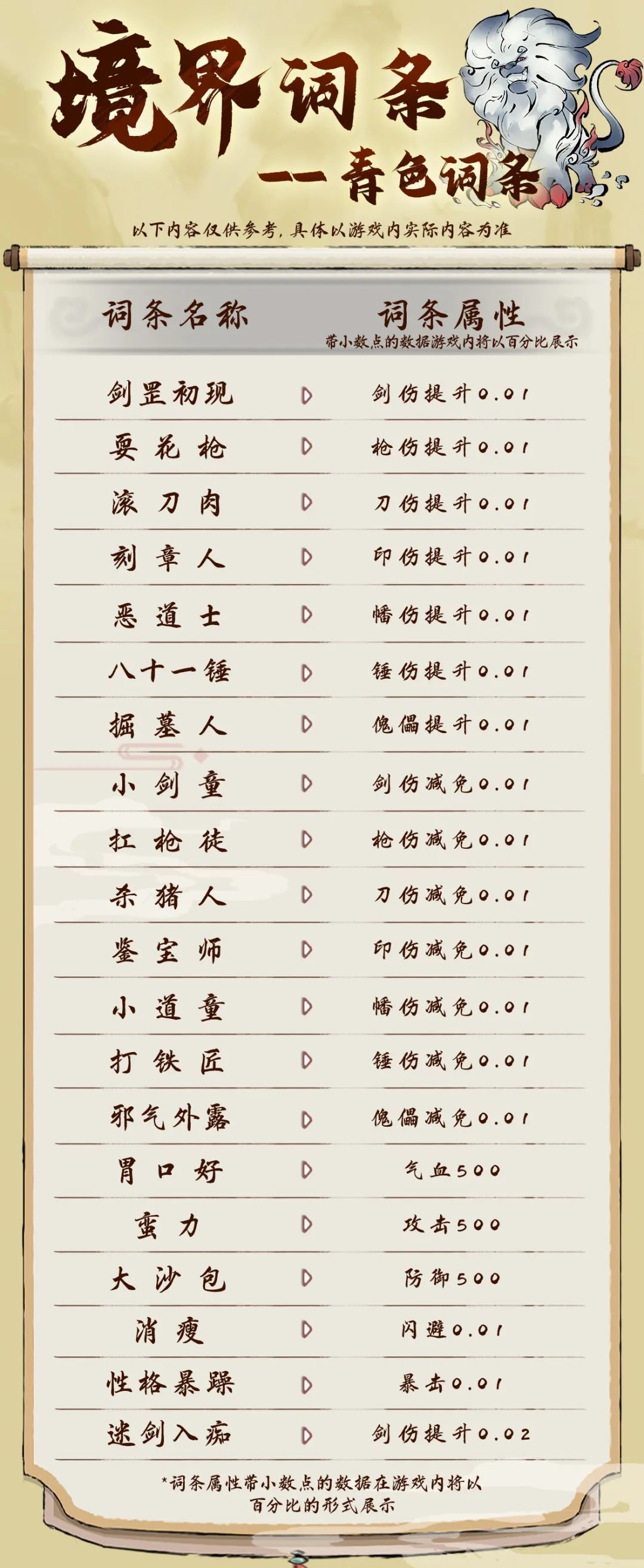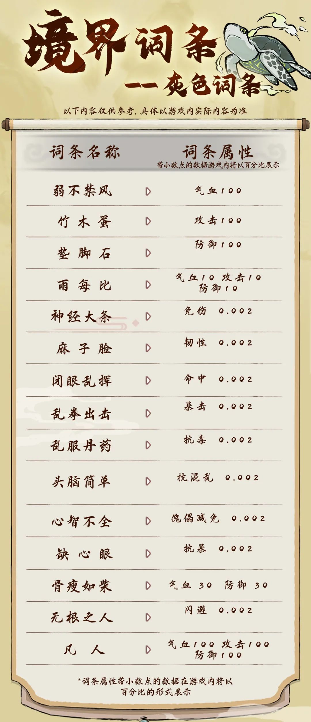 注:以上词条属性带小数点的数据在游戏内将以百分比的形式展示,例如 闪避0.01 命中0.02,游戏内将显示为闪避1% 命中2%。
