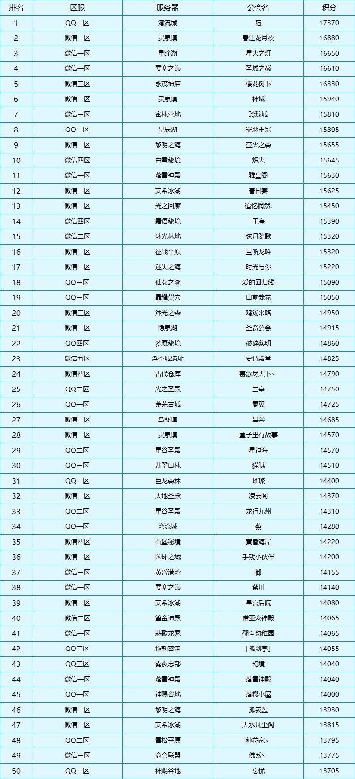 积分排名前50公会名单
