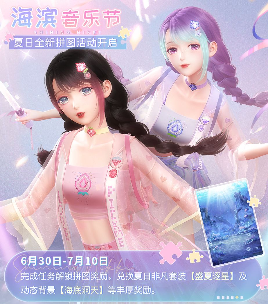 活动期间,参与限时感应及限时累充等任务,收集「应援草莓球」,即可解锁对应拼图,兑换夏日非凡甜美套装【盛夏逐星】、环境-风【盛夏晴风】、粉钻及动态背景【海底洞天】等丰厚奖励。