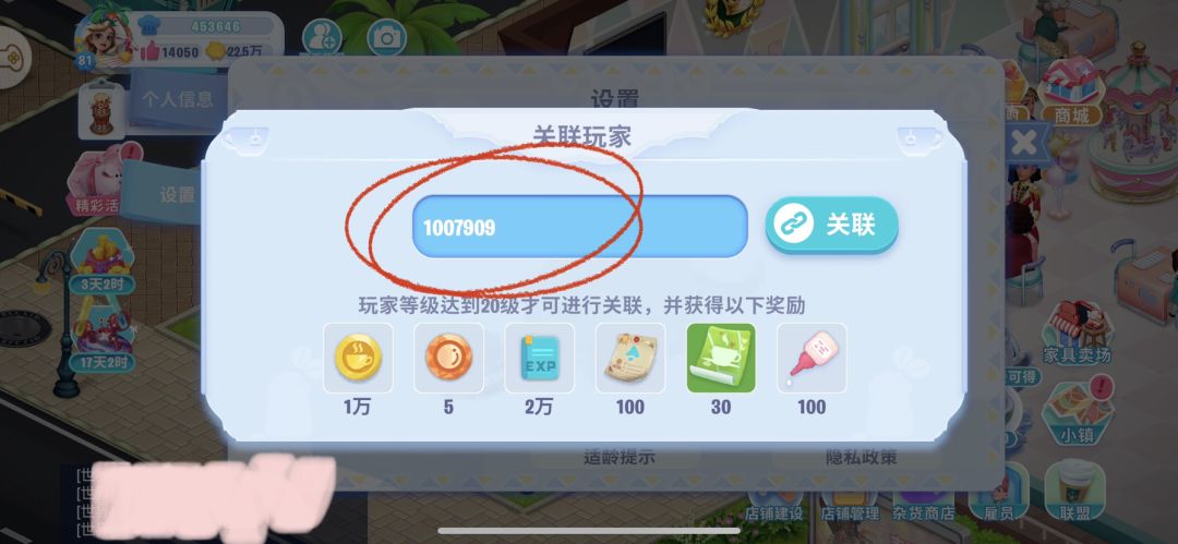 满20级的宝子们,点击头像-设置-关联玩家-输入1007909 即可获得1w金币,5个扭蛋币,2w员工经验,100个升级证书,30张宣传单,100个胶水!