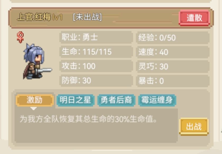 激励根据总生命回血30%+明日之星每次战斗加3血量+勇者后裔拥有更高的生命成长。