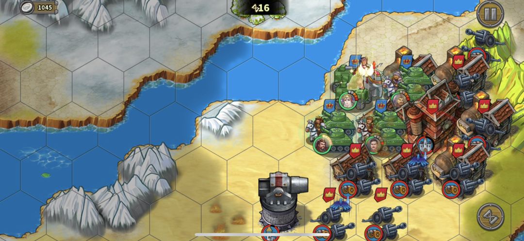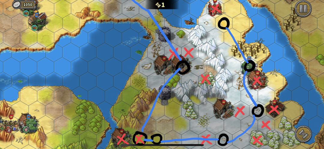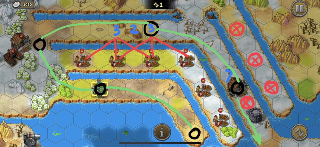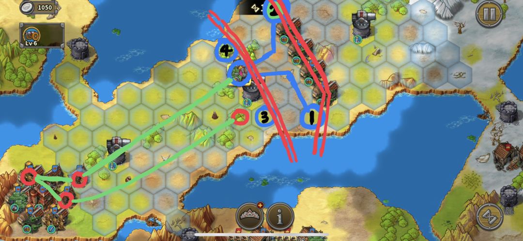 同时一开始神素下去占经济小屋的时候,放一个50%减费工厂公主。造的第一个炮两步走到下方1号位置堵路,第二个炮两步到上方2号位置堵路,构成第一道防线,拖着不让两个怪下来。一般第一道防线撑两回合,还要再造3号和4号做第二道,再第一道破了的时候补上去。防线前面有空位置,就要不断试着把防线向前推,把怪赶到中间留给炮塔和友军炮用燃烧🔥。同时把怪赶到中间方便下路直上去,不用在下面缠斗浪费回合,也方便到中路集合开指挥集中输出。