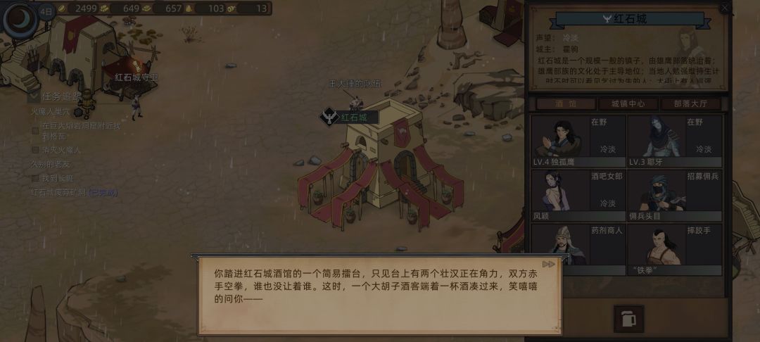 先不理他,一个糟老头子凭什么听你的。先去红石城,漂亮的酒吧女在等我!说不定还能遇见我的老婆们。出发,红石城酒馆,请大家喝一杯,正当兴高采烈酒意浓。一帮地头蛇上来找我过几招,美女当前岂能丢份。**。