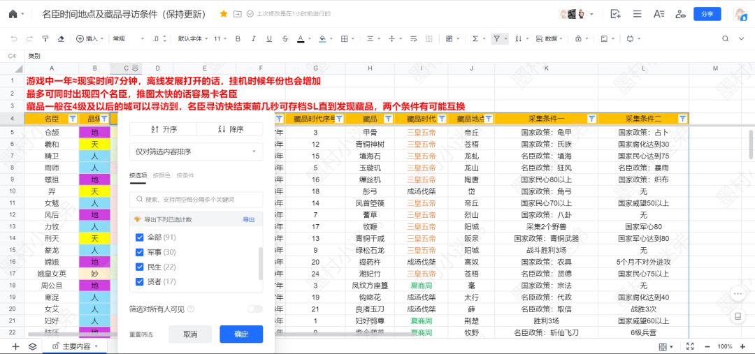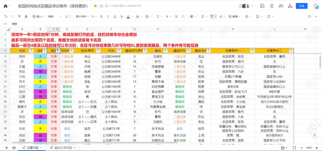 今天带来名臣时间地点及专属藏品寻访条件一览,会随着版本更新或者勘误持续更新,按图索骥,方便集齐名臣及藏品!