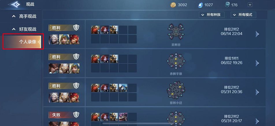 (2)点击【个人录像】按钮即可查看自己的过往对局记录