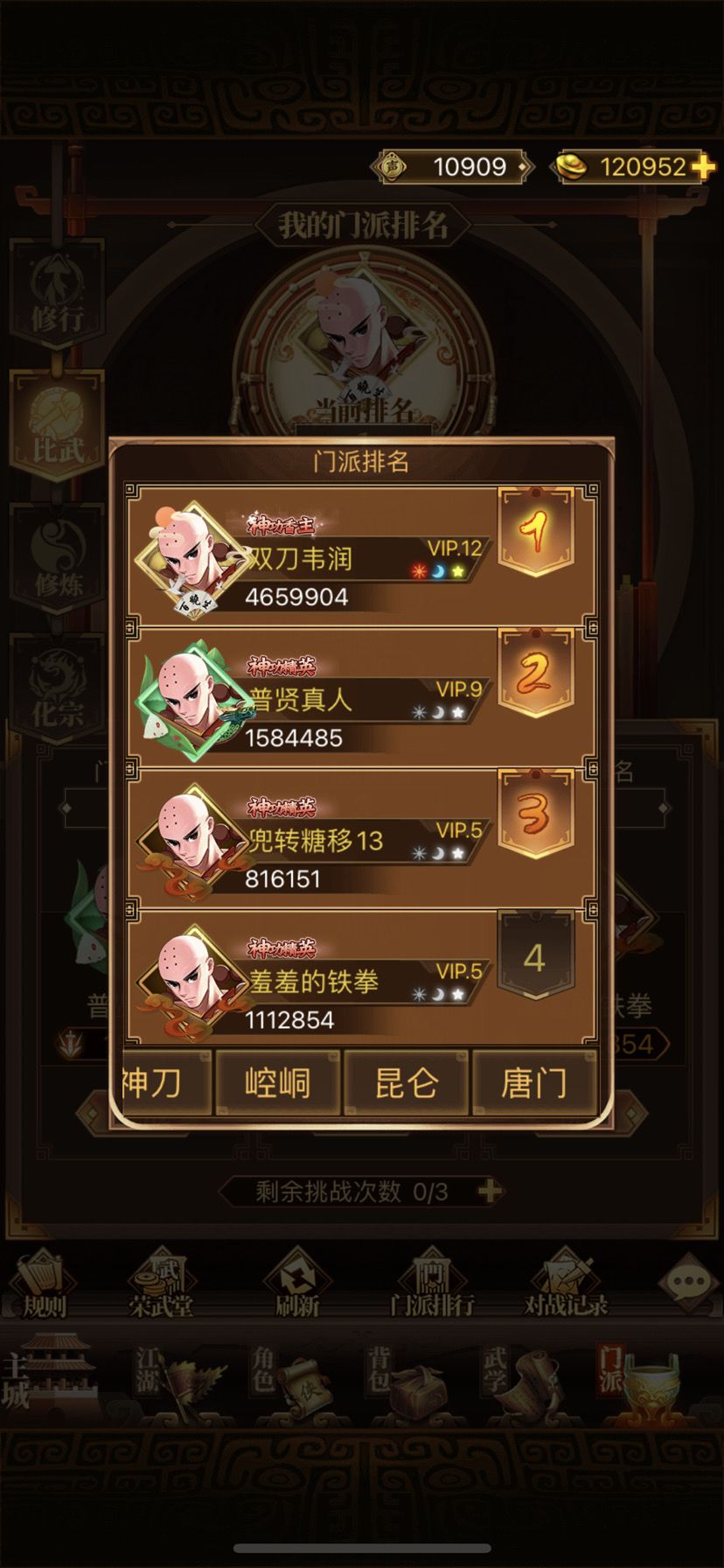 其次,他玩的四大神僧组合,伤害不高,但我的伤害也不高,因为刀妹也是v5,还比他晚几天,想靠伤害,拼面板打赢他肯定不行。即便复刻一套四大神僧也没机会的。于是就先养养号,攒攒积分换一套五毒出来(主要是缺50积分的一本赤练毒掌)