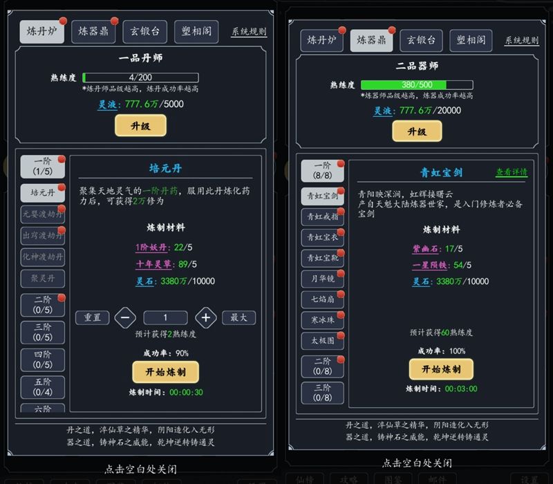 百炼堂之中,分为炼丹炉、炼器鼎、玄锻台和塑相阁四处。其中炼丹炉和炼器鼎顾名思义是炼丹炼器的地方,玄锻台可以为装备精炼铸星,而塑相阁则可以炼化法相。其大致方法都是类似的,依据已学习的配方,消耗材料来进行炼制。其中炼丹炼器还有一个丹师/器师等级,对应等级越高,则炼制成功率越高,而这个等级的提升主要靠多次炼丹炼器获得的熟练度。在炼丹时还有概率暴击,获得额外产出。