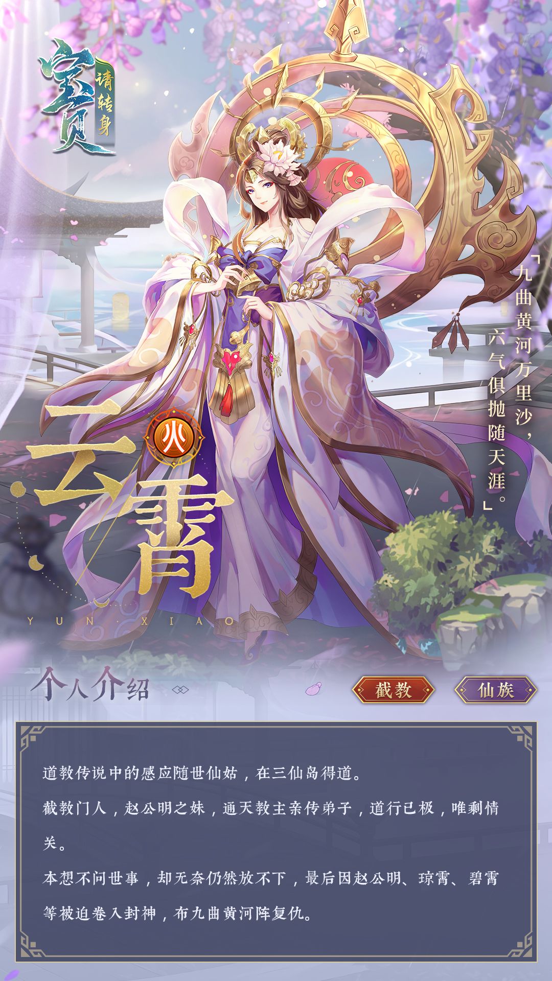 截教门人,赵公明之妹,通天教主亲传弟子,道行已极,唯剩情关。