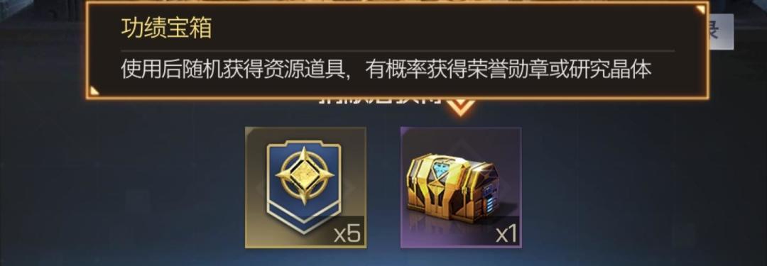 功绩宝箱使用后随机获得资源道具,有概率获得荣誉勋章或研究晶体。