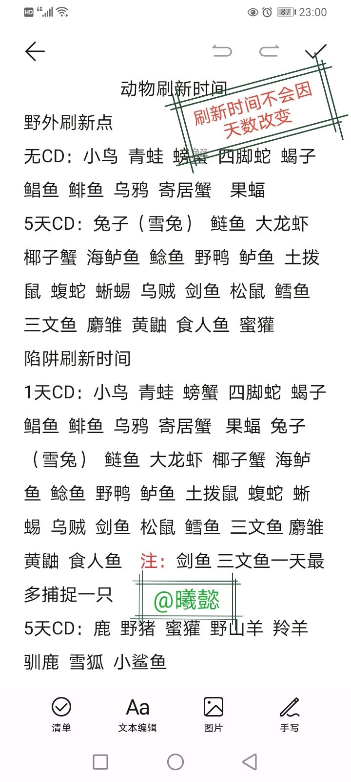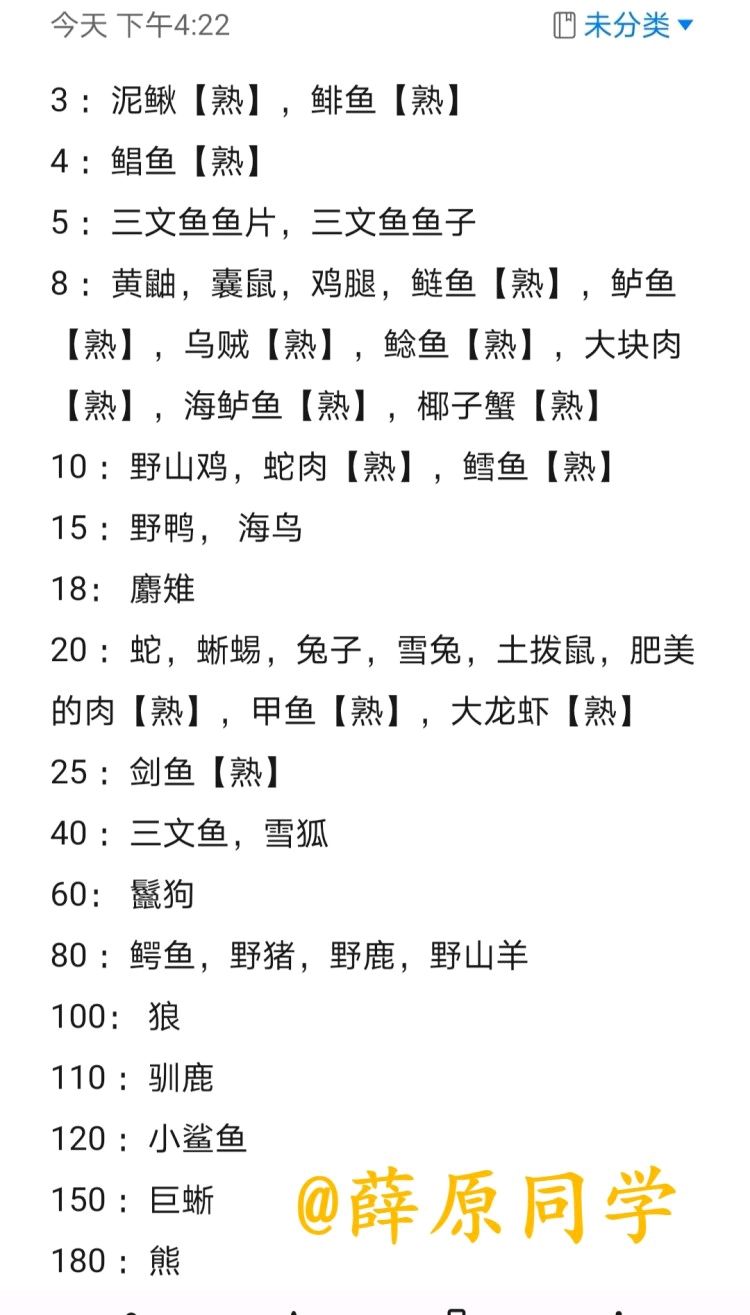 3.关于抓猎物CD:抓到大型猎物后,5天后才能再抓到大型猎物。比如你抓了一头鹿,5天后才能再捉到鹿,各猎物CD如图(图片来自曦懿):