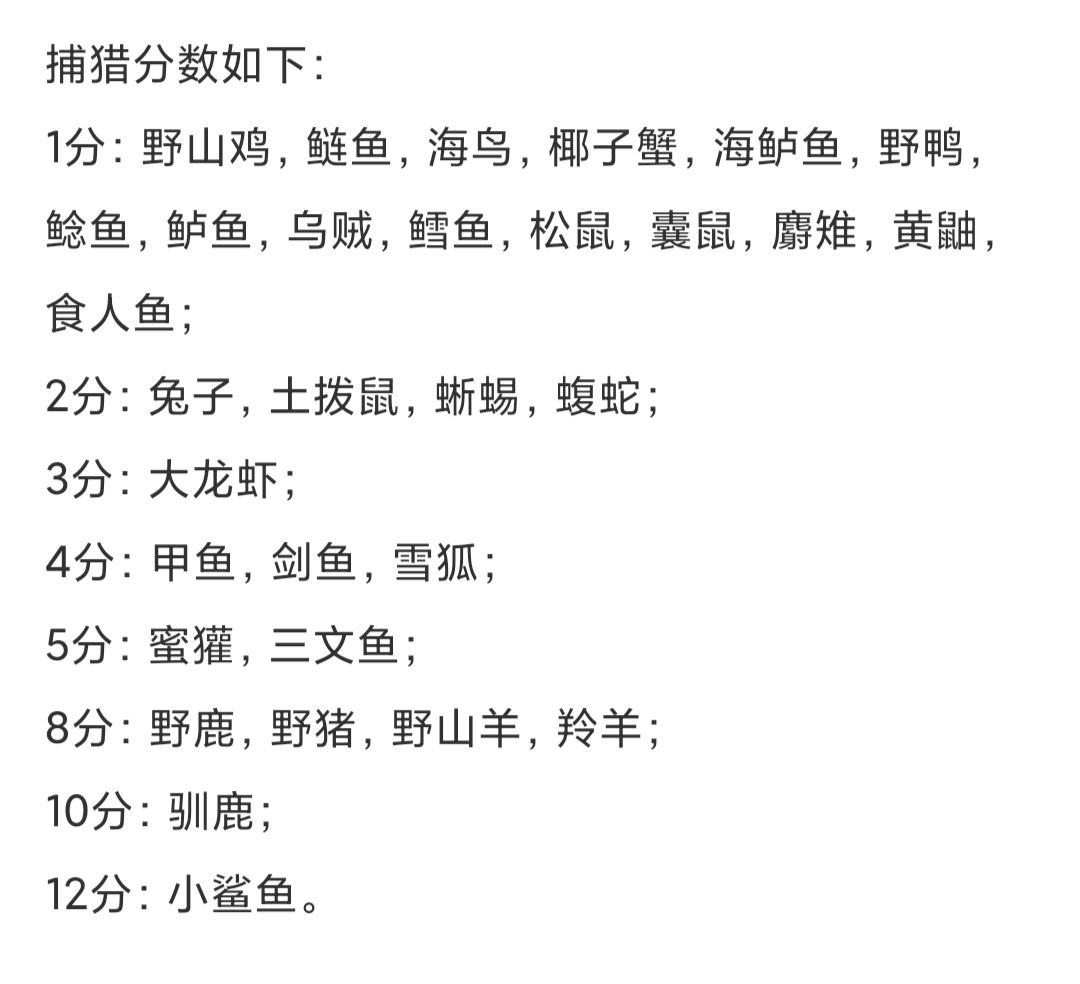 捕猎:以任意方式抓到中大型猎物,分牌上与总分相同,具体见下图(图片来自小雨加雪)
