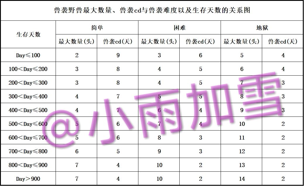 1.兽袭时间与野兽数量:兽袭会在30天开始,来的野兽数量跟兽袭难度和你的肉数量有关