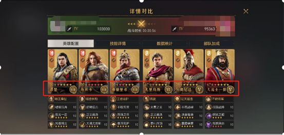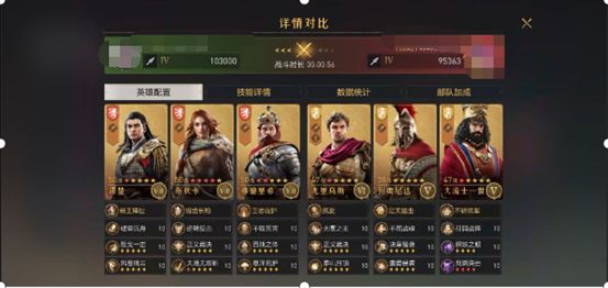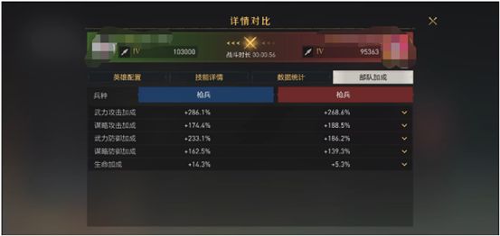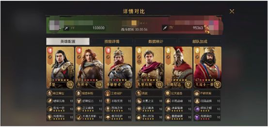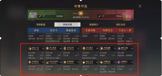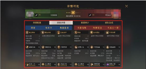 详情对比分为四个方面,分别是英雄配置,技能详情,数据统计和部队加成。