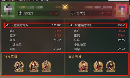 在红框中我们可以发现,我们两个人的兵种相同,带兵数量有小部分差距,英雄配置强度也是相同的,但是他的红度和我们也有差别,也就导致目前他单挑打不过我们,战损也高于我们非常多。